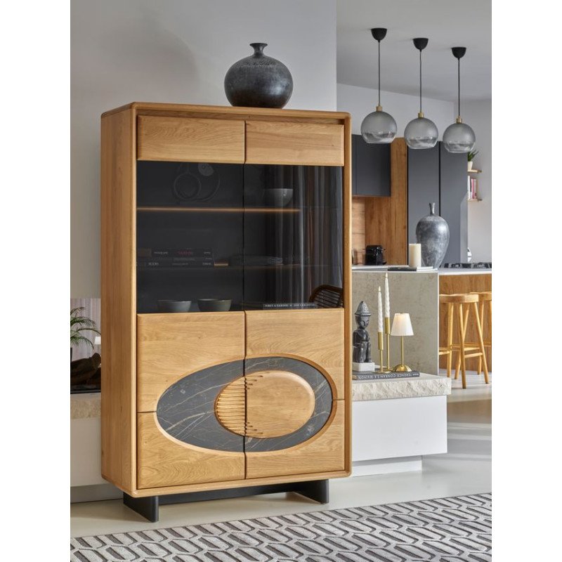- Dessus, côtés, plancher : chêne massif. - Portes : sur charnières invisibles avec amortisseur. Support en médium 13mm toujours laqué noir mat, panneaux décors en chêne massif vissés depuis l'arrière des panneaux support. Décors en céramique marbrée maintenus en feuillure dans les décors chêne.