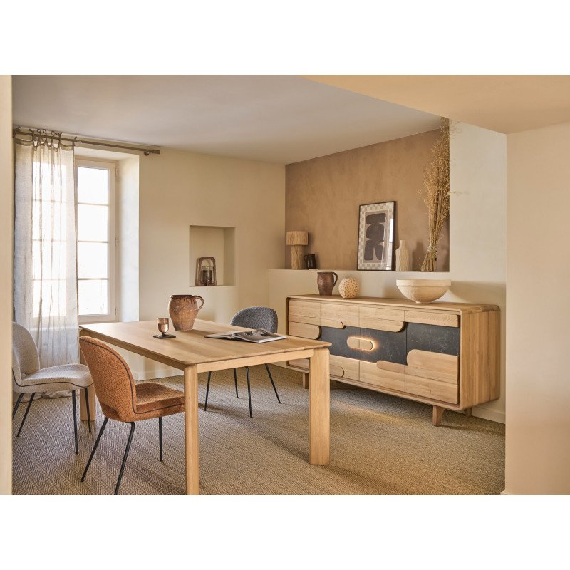 Séjour contemporain du fabricant de meubles français Couture alliant principalement le chêne massif et une céramique noire marbrée pouvant meubler la salle à manger ( enfilades, tables, chaises etc ), le coin salon ( meuble télé, table basse ou vitrines, colonnes etc ) ainsi que l'entrée par exemple avec les petits meubles type console ou meuble d'entrée.