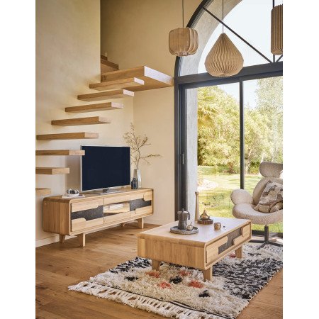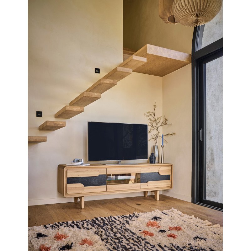 Séjour contemporain du fabricant de meubles français Couture alliant principalement le chêne massif et une céramique noire marbrée pouvant meubler la salle à manger ( enfilades, tables, chaises etc ), le coin salon ( meuble télé, table basse ou vitrines, colonnes etc ) ainsi que l'entrée par exemple avec les petits meubles type console ou meuble d'entrée.